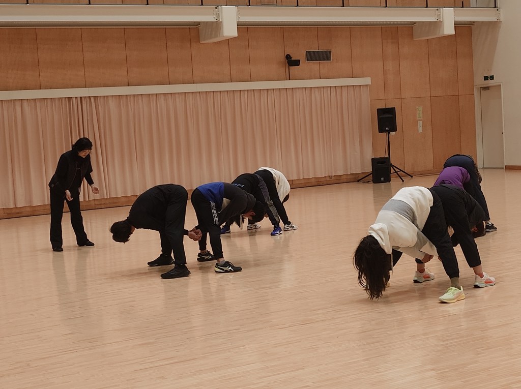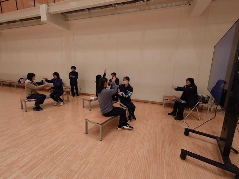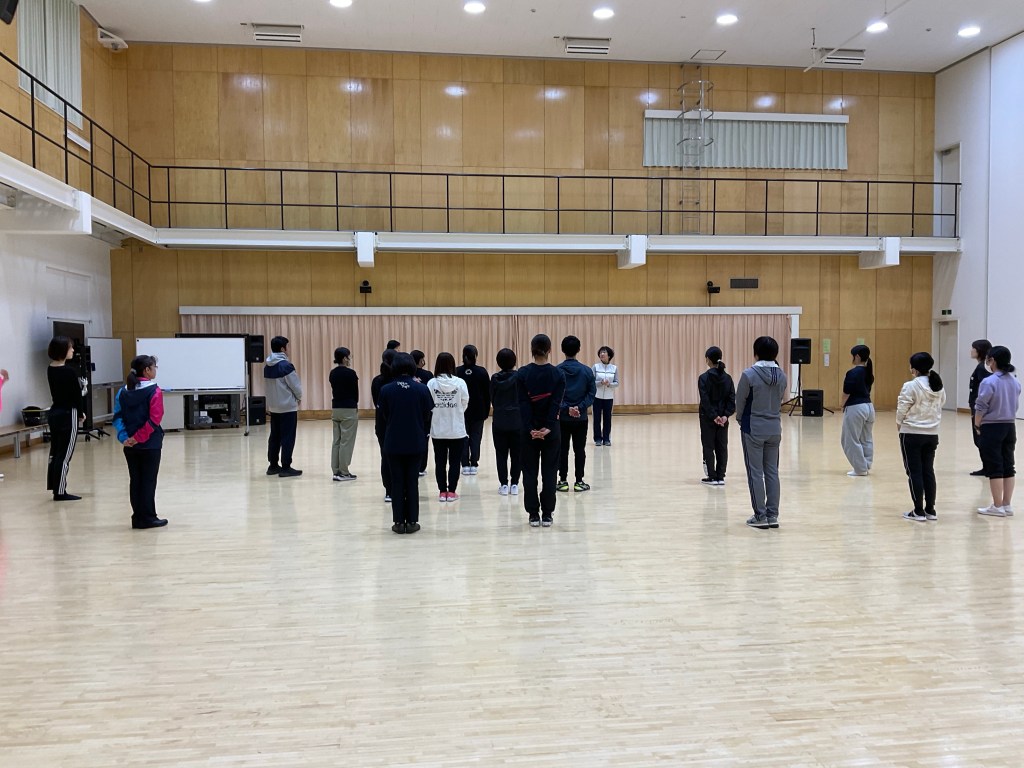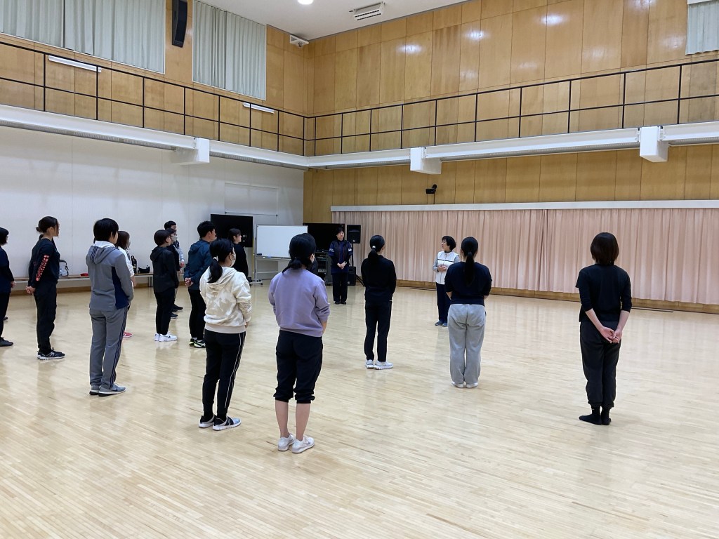 始めに、寺山先生から表現・ダンスの内容とその特性について講話がありました。ダンス領域の特性は、できる、できない、ではなく学習者それぞれの「個」の身体表現を大事にすることであり、そこにはすべての教育に共通する学びの本質がある、と述べられました。動きを「与える」のではなく、「引き出す」ことが大切であり、即興表現を大事にしていることを強調されました。