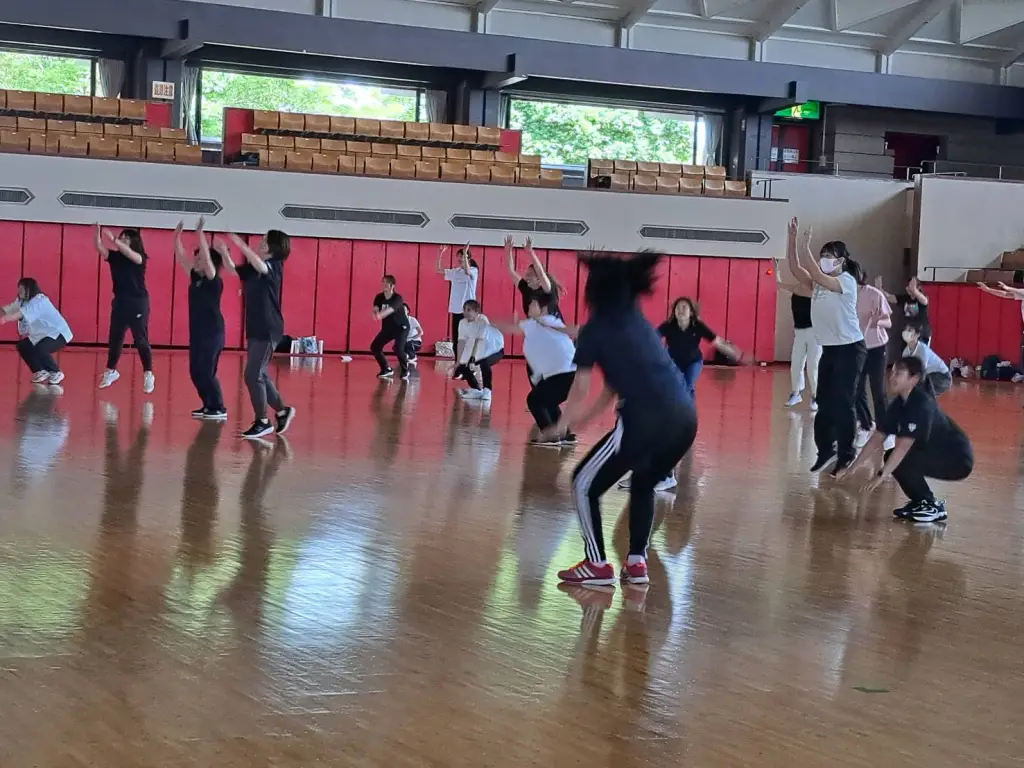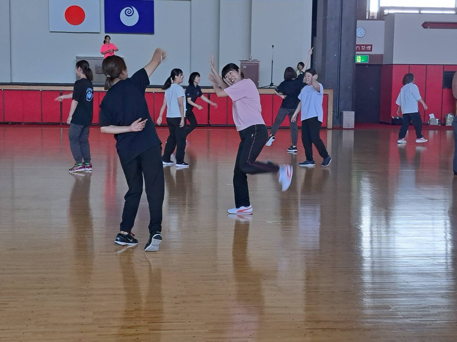 次に、運動会で行うリズムダンスでは、子どもたちの知っているノリのいい曲に合わせて、講師が創作したリズムダンスを2曲練習して踊ることができました。年齢に応じて優しい動きにするなど、実際に即して活用できるようにアドバイスがありました。